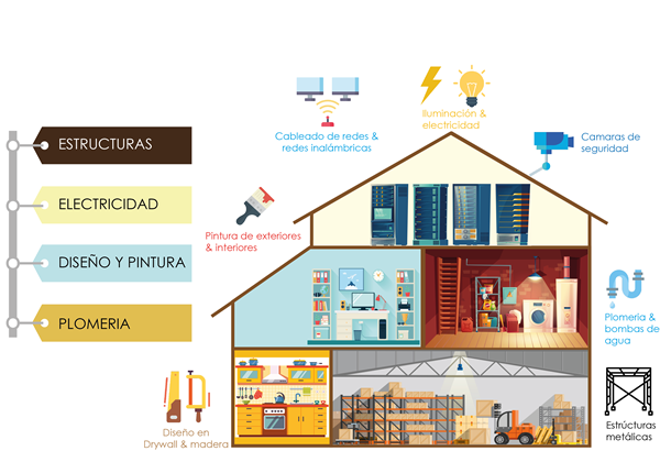 Pintado de exteriores, Interiores, Instalación de iluminación, cableado eléctrico y mantenimiento en general.